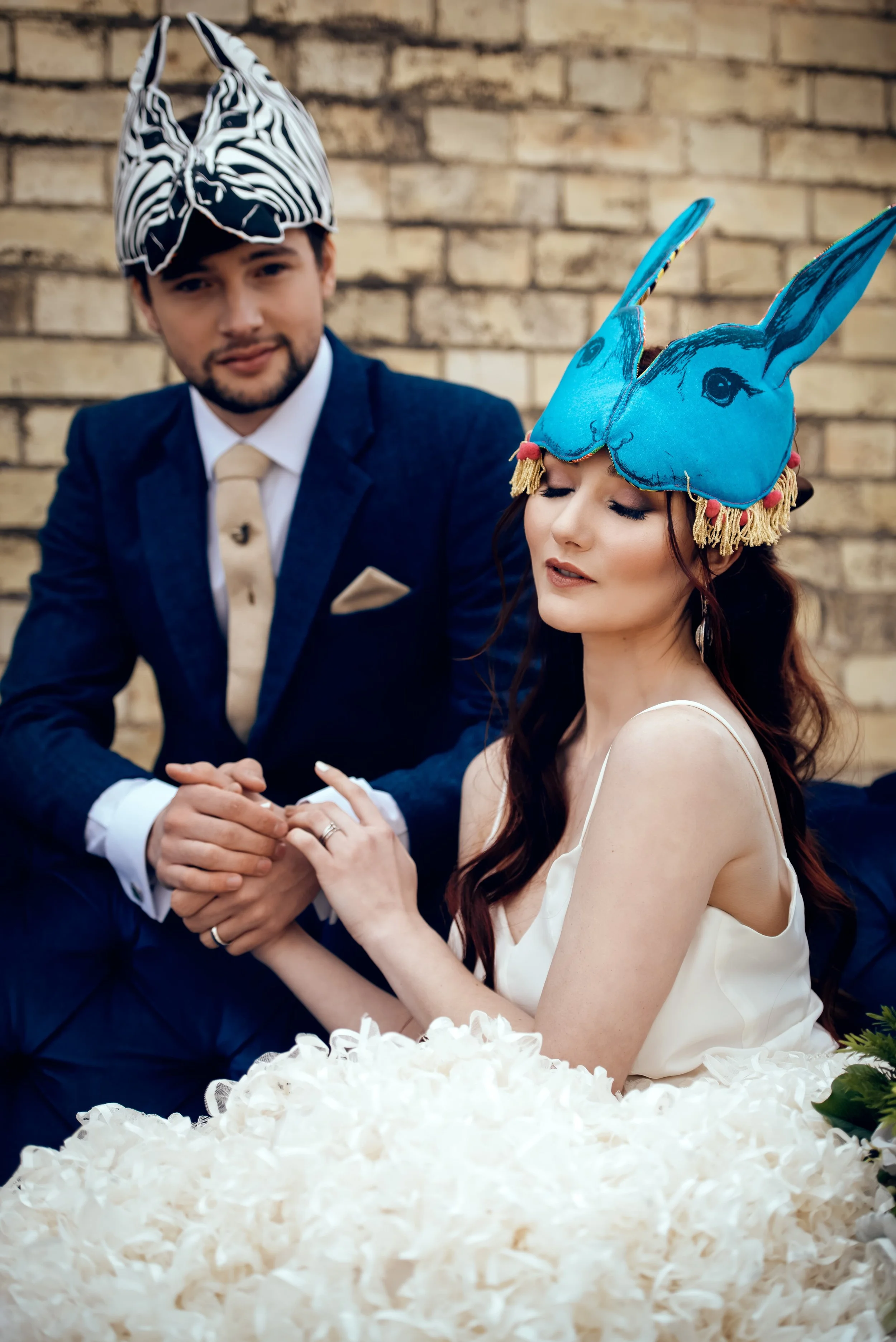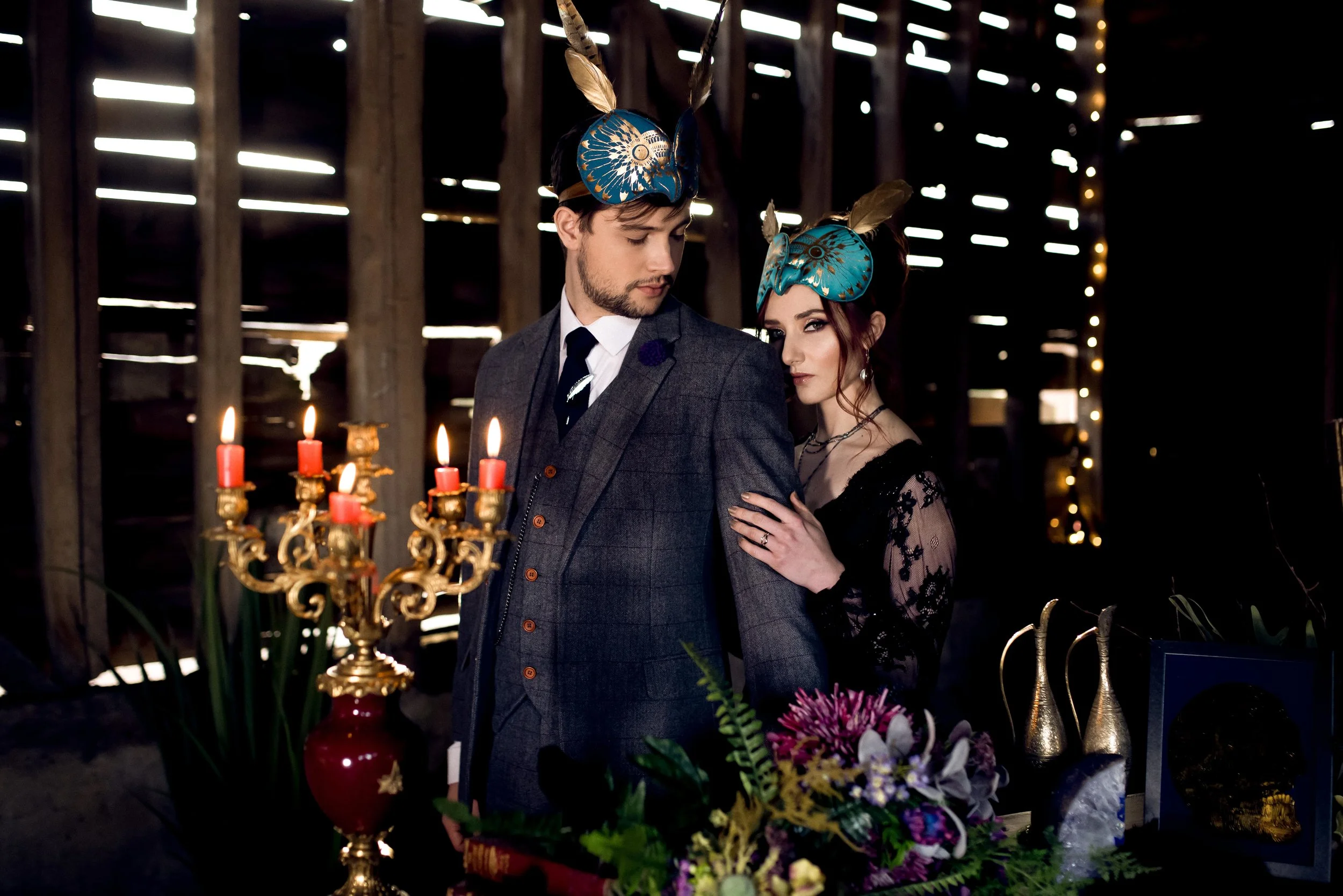 Venue is Lodge Farm | Photography by MarkUza Photography | Cine film by Cine Reportage | Styling & Florals by VV Raven | Dress from River Elliot Bridal | Make up & Hair by Ieva Genovesi | Vegan painted leather jacket by Lucky sew and sew | Jewellery from Boutique Boheme | Tiaras from Samantha Walden | Grooms suit by Vintage Suit Hire | Props from Prop Factory | Wedding cake by Fifi’s Cakery | Animal masks from Animalesque | Stationery by Nat’s Paper Studio | Feathers from Plucking Fabulous | Collage art by Julie Kuyath | Gold leaf typography from Andrew J Mason | Model’s are Bernadette Lemon & Joshua Gould
