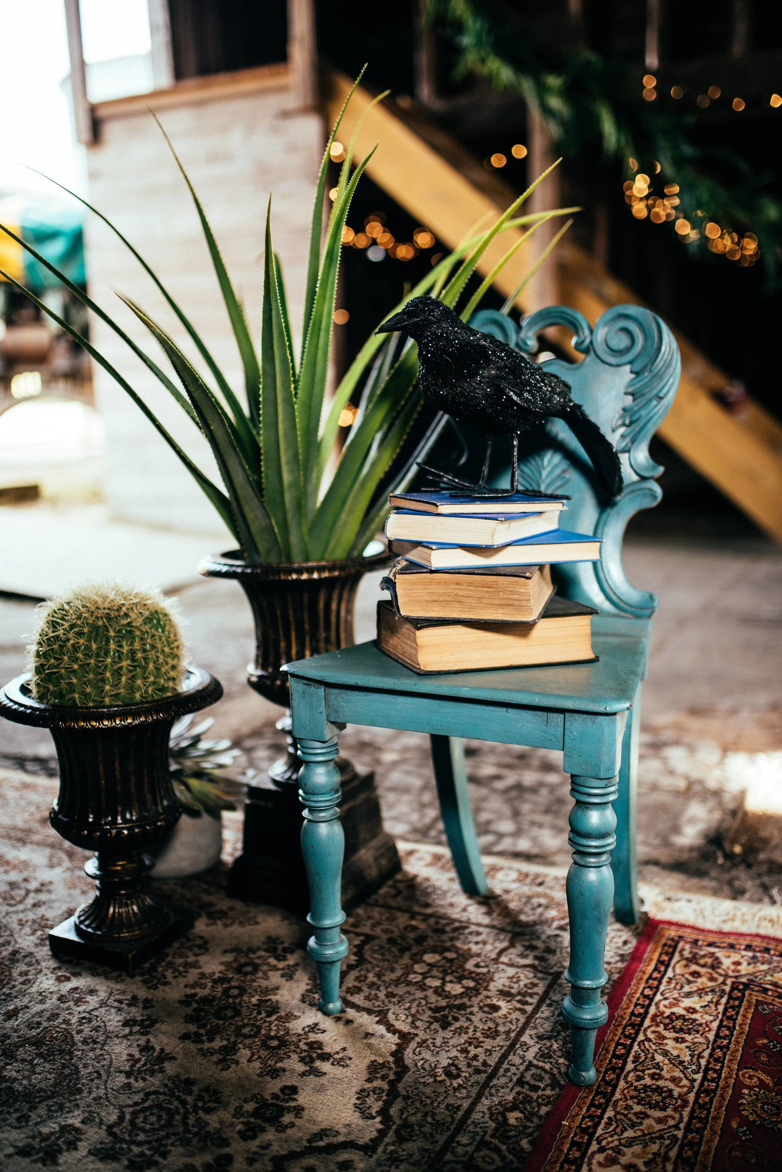 My styling was inspired by the fertility and purity of the rebirth of a fresh new spring with virginal tones of blue and white. Faux ferns and foliage were used to create a lush botanical feel to the spaces. Bare trees foraged from the farm were used to decorate the outdoor room created; trees have a symbolic meaning incorporating strength, transformation and wisdom. – All very relatable to a wedding day.”