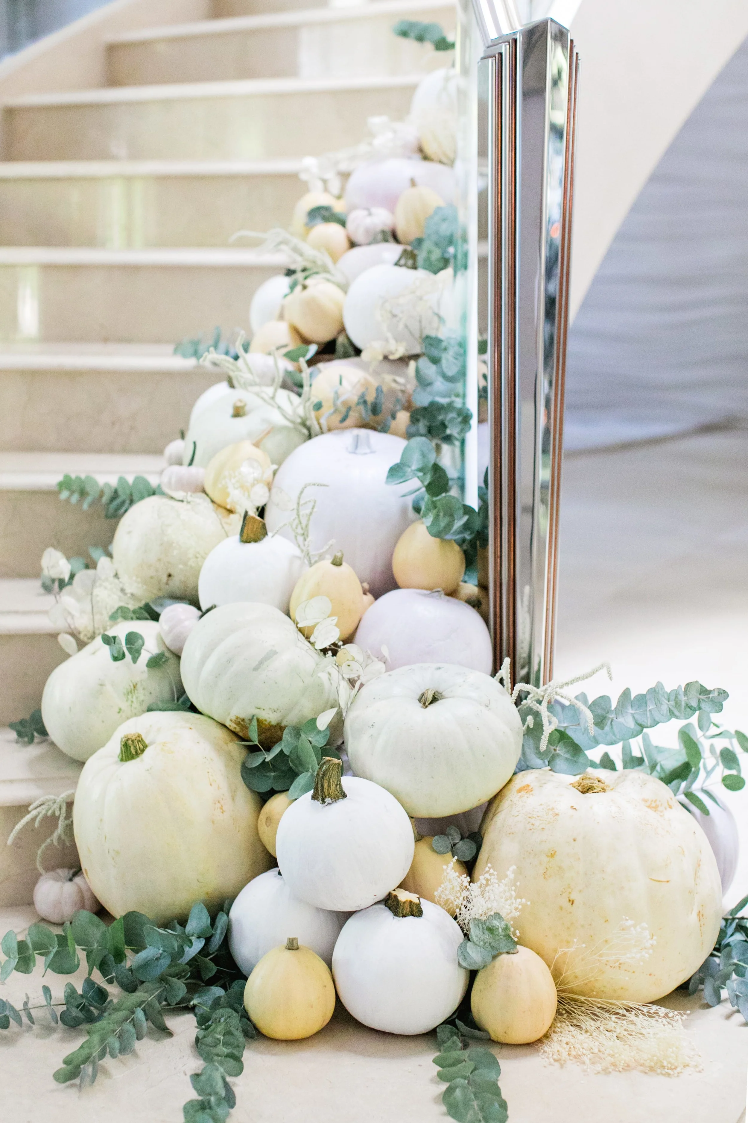 For the staircase, Bloomologie created a flowing pumpkin display, interlaced with various leaves and foliage. This was then given a sophisticated twist for the evening celebrations by incorporating some black and gold pumpkins as well as some tall taper candles which created a lovely moody ambience.