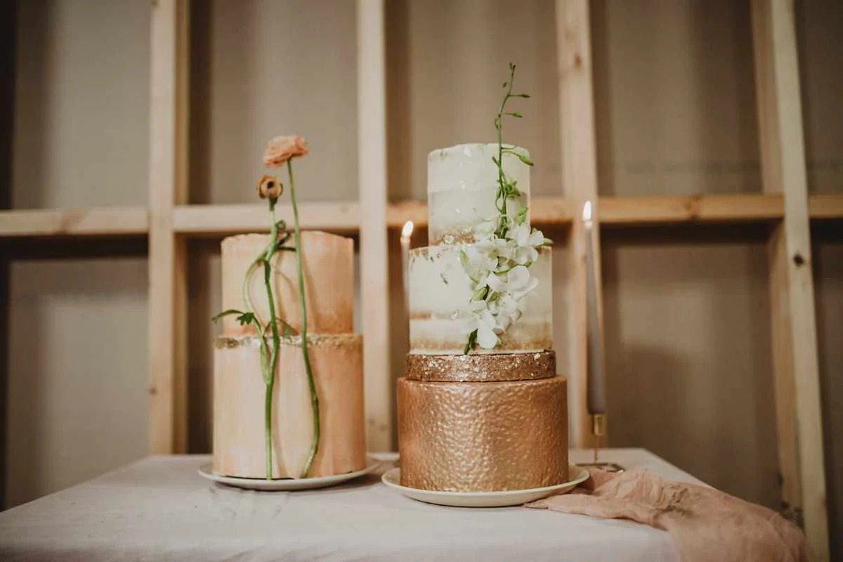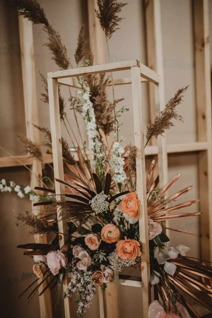 Our second set-up against a pre-fabricated timber wall also featured this super textured floral mix, where giant sylvan bundles of peach tones, whites and golds sprung from the floor amongst white pillar candles and from the wooden shelf. A bouquet made of only a couple of orchid stems and some reeds emphasised the slightly surreal minimalist editorial look, so as not to detract from the outfits, and single stems were also used to add some height to the hand-brushed and dappled copper tiered cakes by Sugar Buttons Cakes.