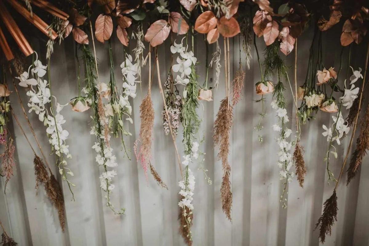 The Little Lending Company decorated the space with hanging cube structures and suspended stems, washed soft pink linens and oversized fan-like tone-on-tone florals from Swaffham and Fakenham Florist. The colour palette was muted but made an impact, with softer lilacs and dried Norfolk reeds mixed with too-good-to-be-true orchids and copper sprayed foliages.