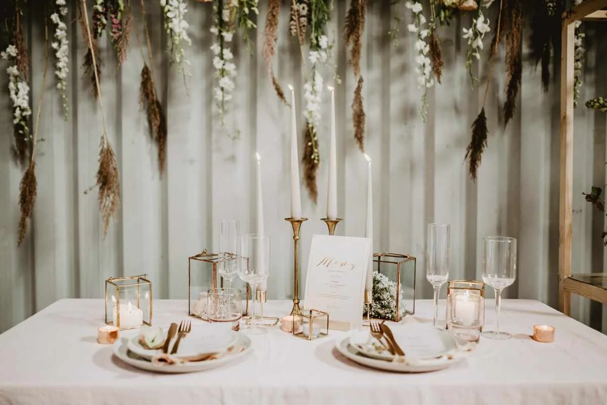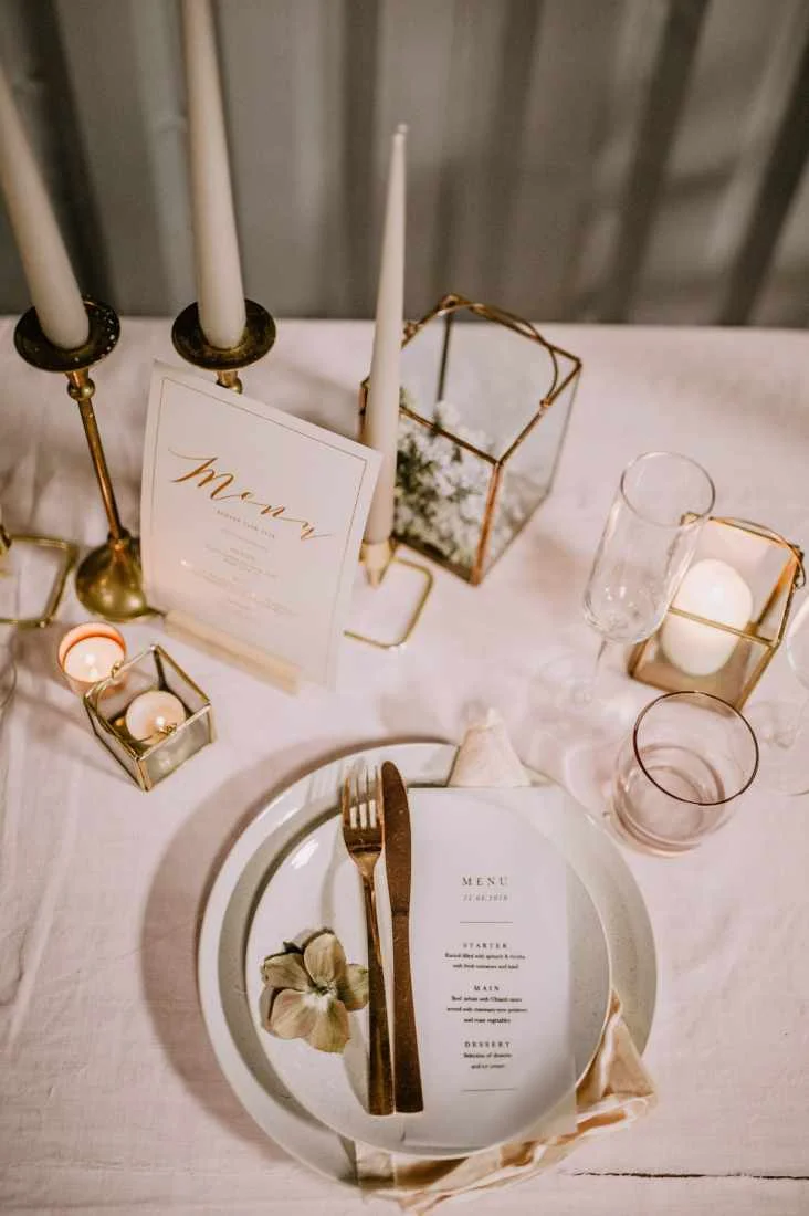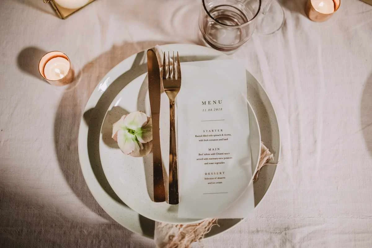 We continued this subtle colour palette into the tablescape. Printed menus in gold font from Nat’s Paper Studio sat in modern pale wood holders alongside off-white crockery, hand-dyed linen napkins and copper cutlery, whilst mixed square candles and copper tea light holders finished the pared-back feel. To add height, we used Ester and Erik tapered candles – every wedding stylist’s go-to candles right now!