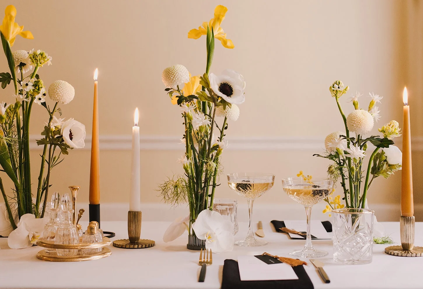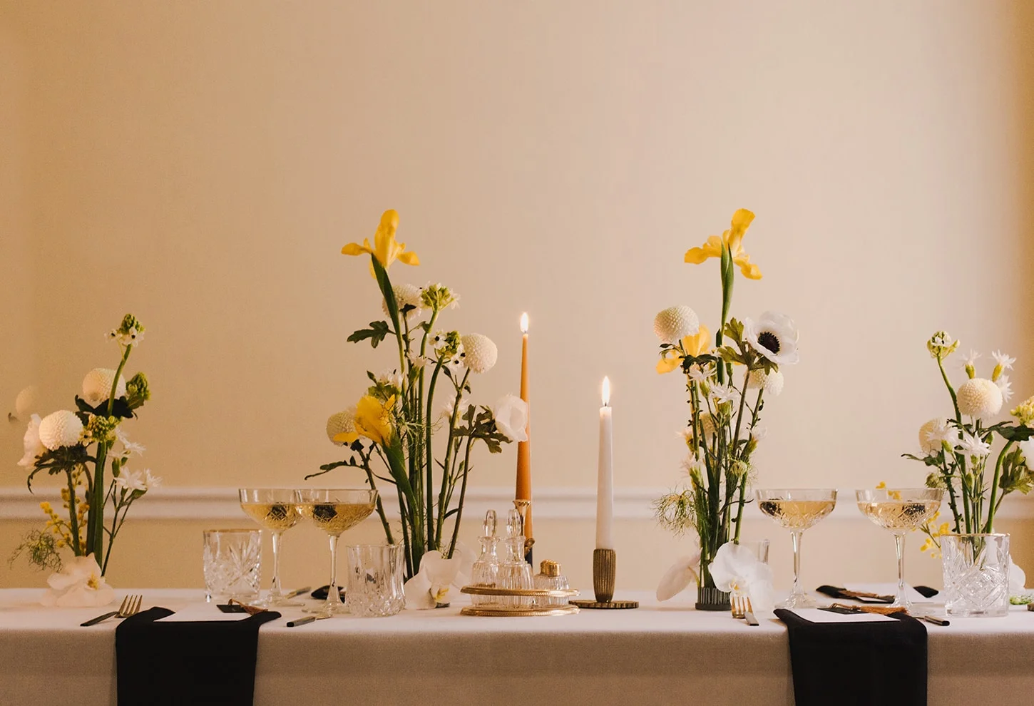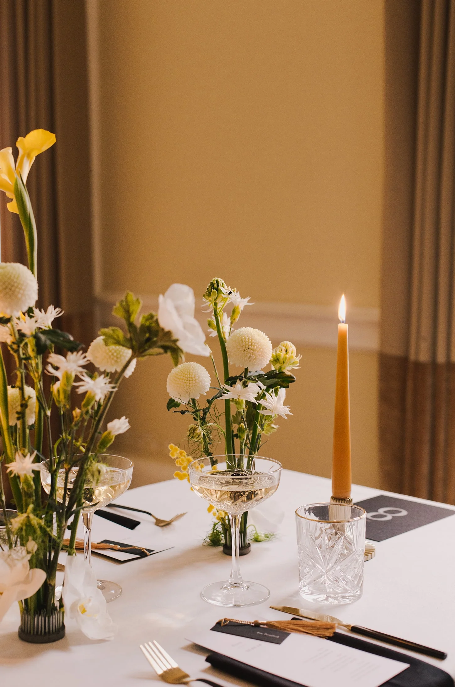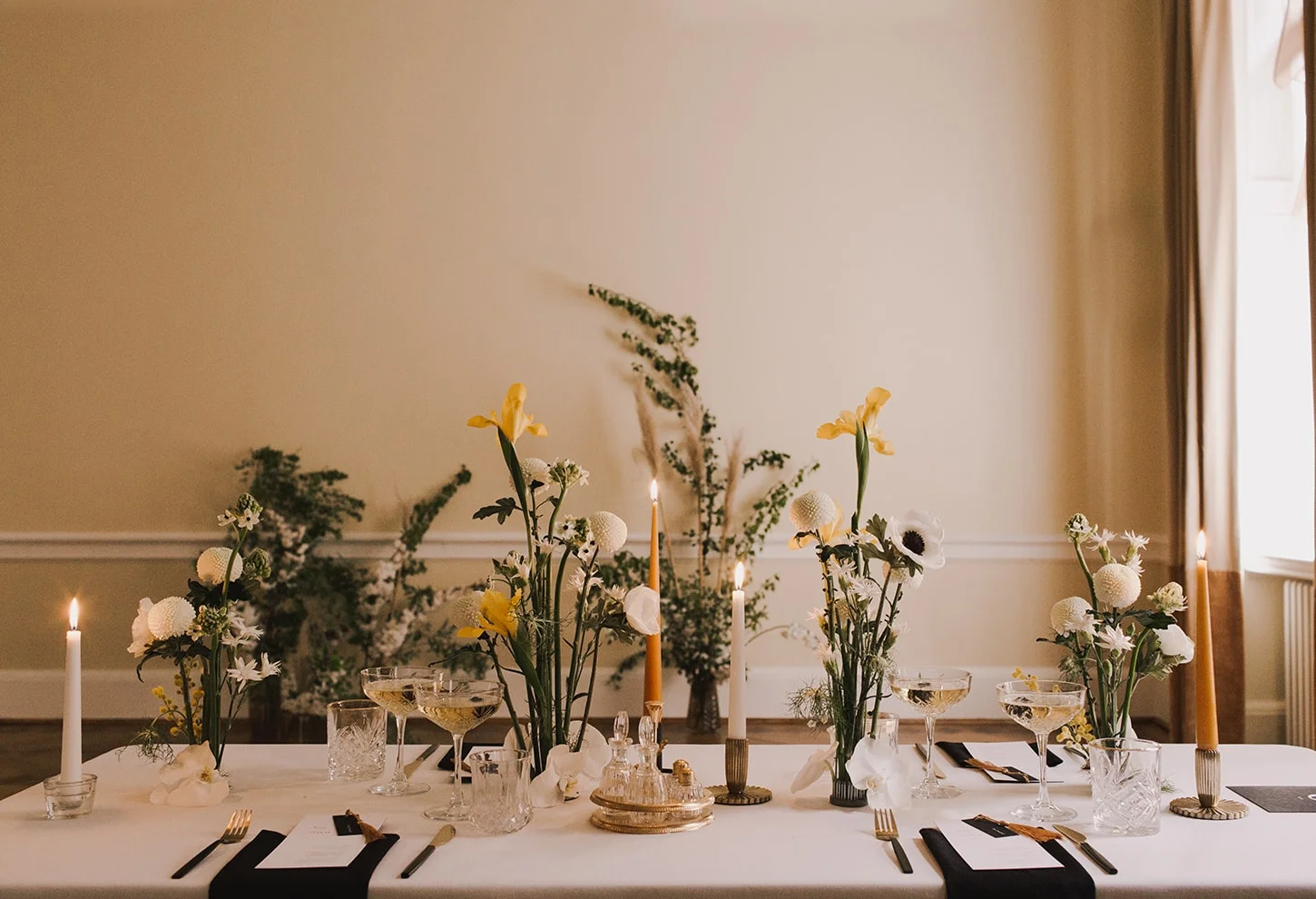 My floral design was where I wanted to create something different. I was very keen to keep the florals to a minimum and create more installation pieces rather than centerpieces. I worked with the wonderful ladies at Stems and Bows and they really understood my brief of ‘more high end fashion event than wedding’. They updated the ‘floral arch’ to a wall backdrop using 3 mustard vases and a mixture of pampas, white blossom and tall foliage. I loved how we could rearrange the vases to create different scenes and use them in different areas of the venue.