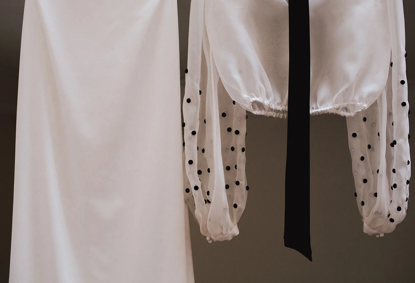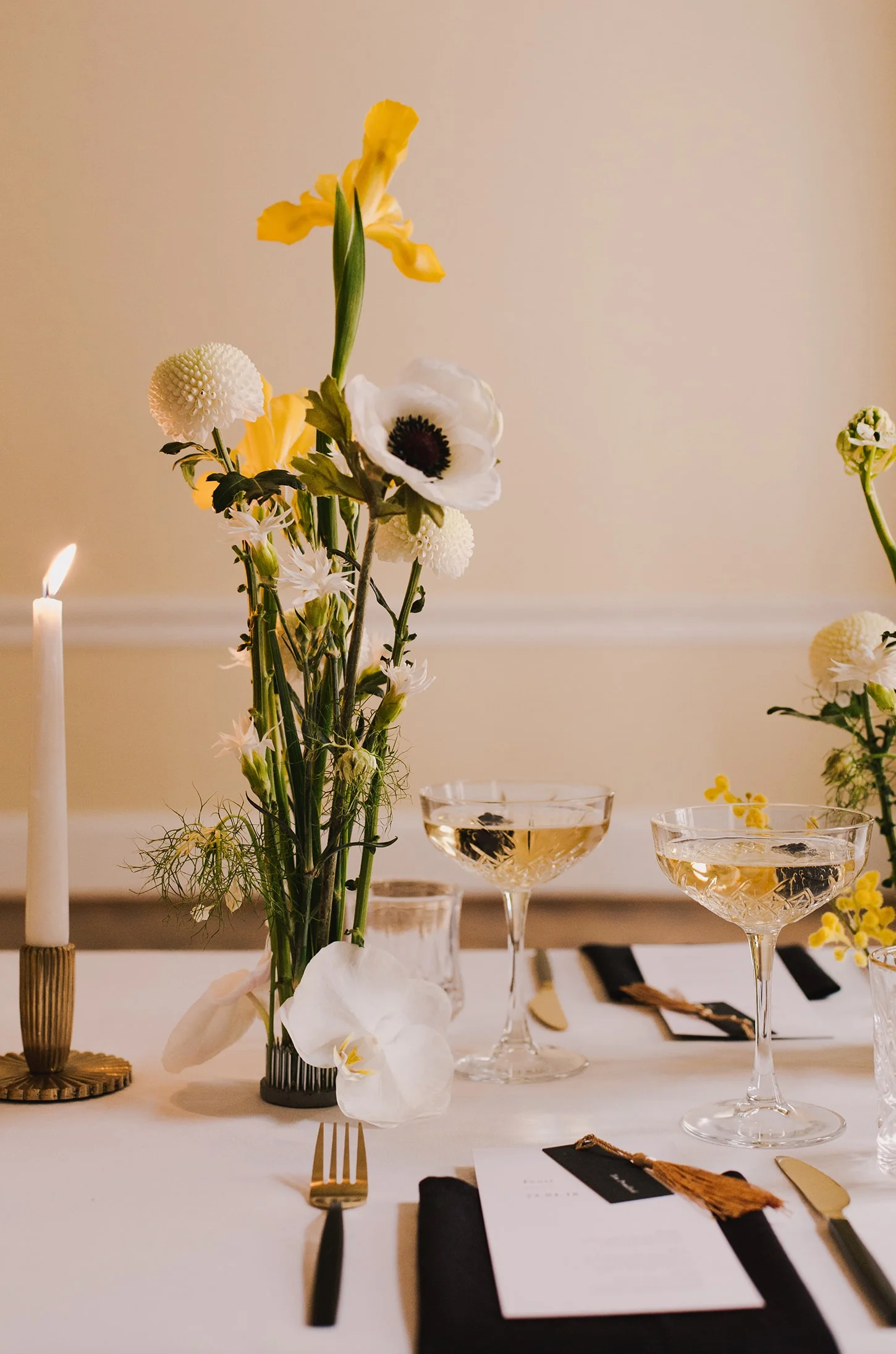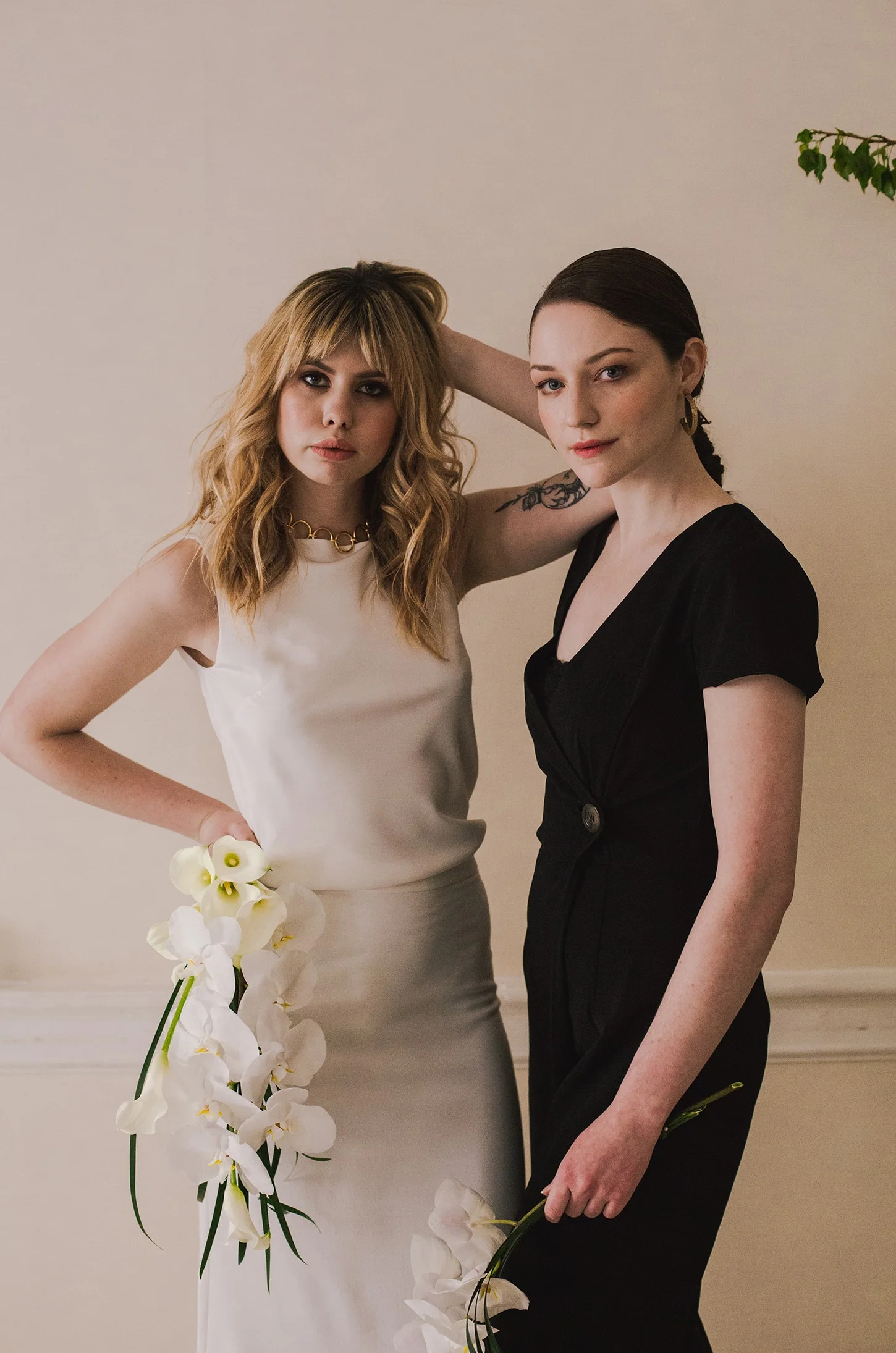 I worked with a colour palette of monochrome with accents of gold and mustard. Simple, chic and timeless elegance. I combined vintage props and modern design to have an undertone of that old time classic love but keep it fashion-forward and edgy. Understated styling that makes an impact.