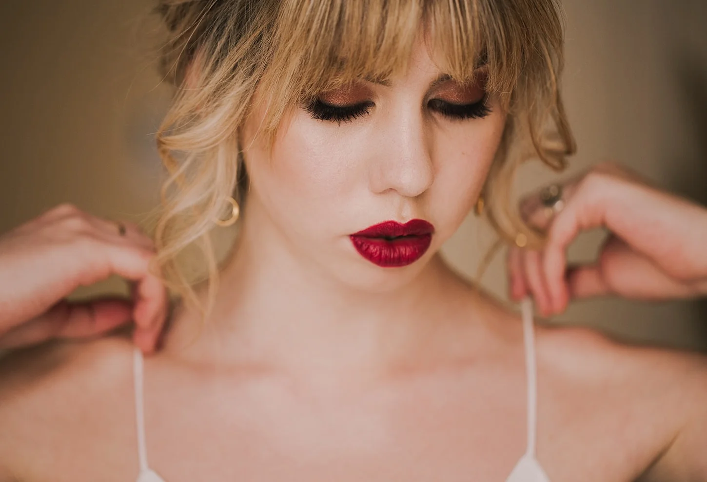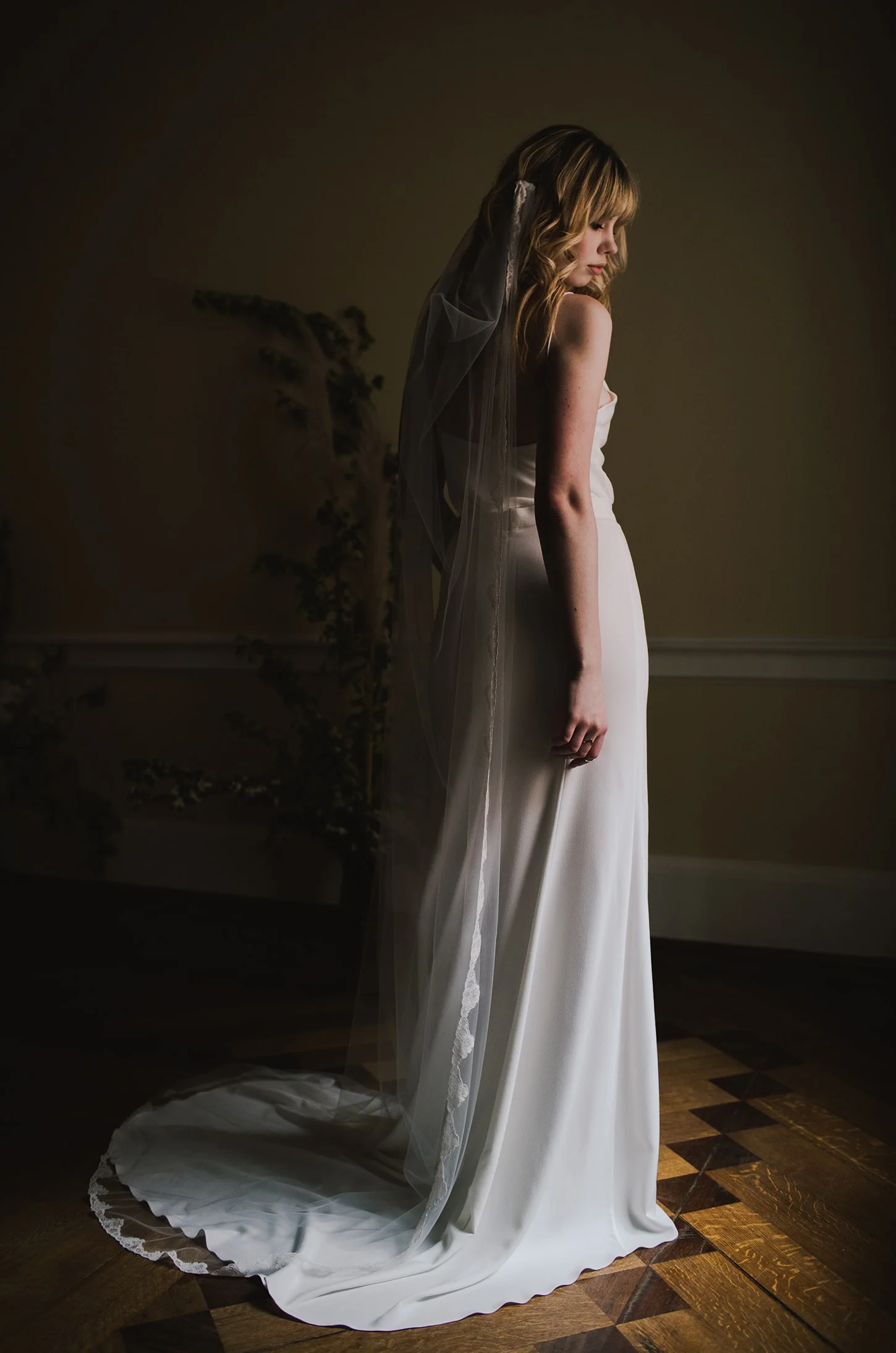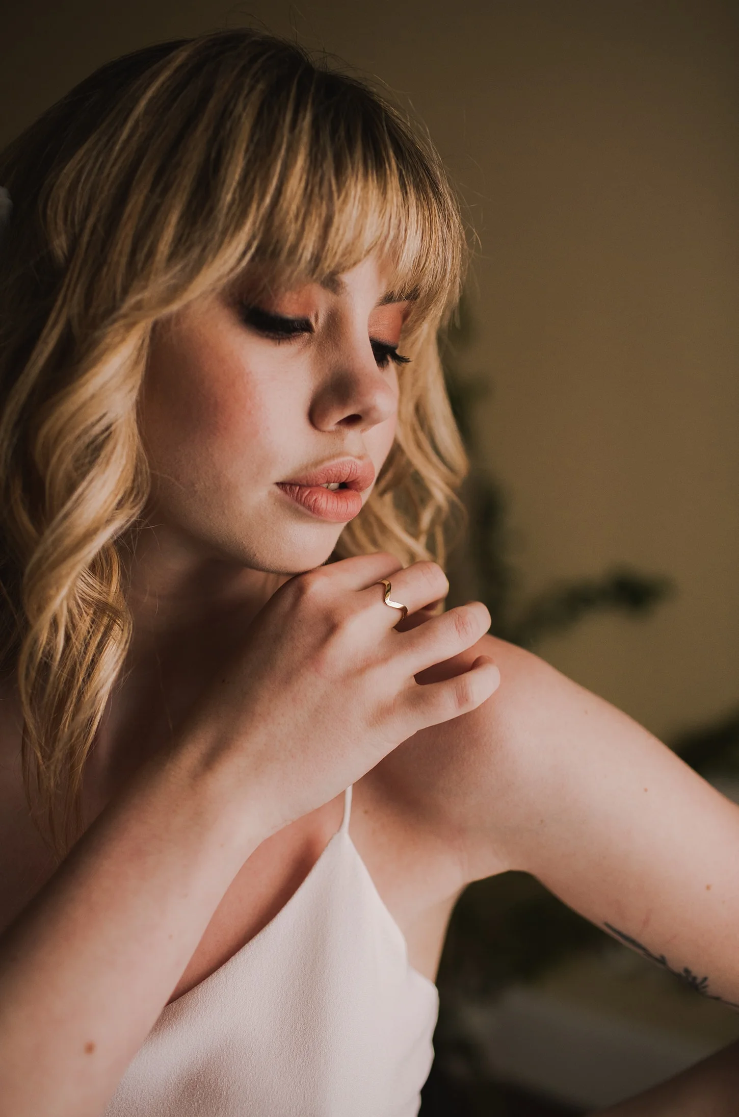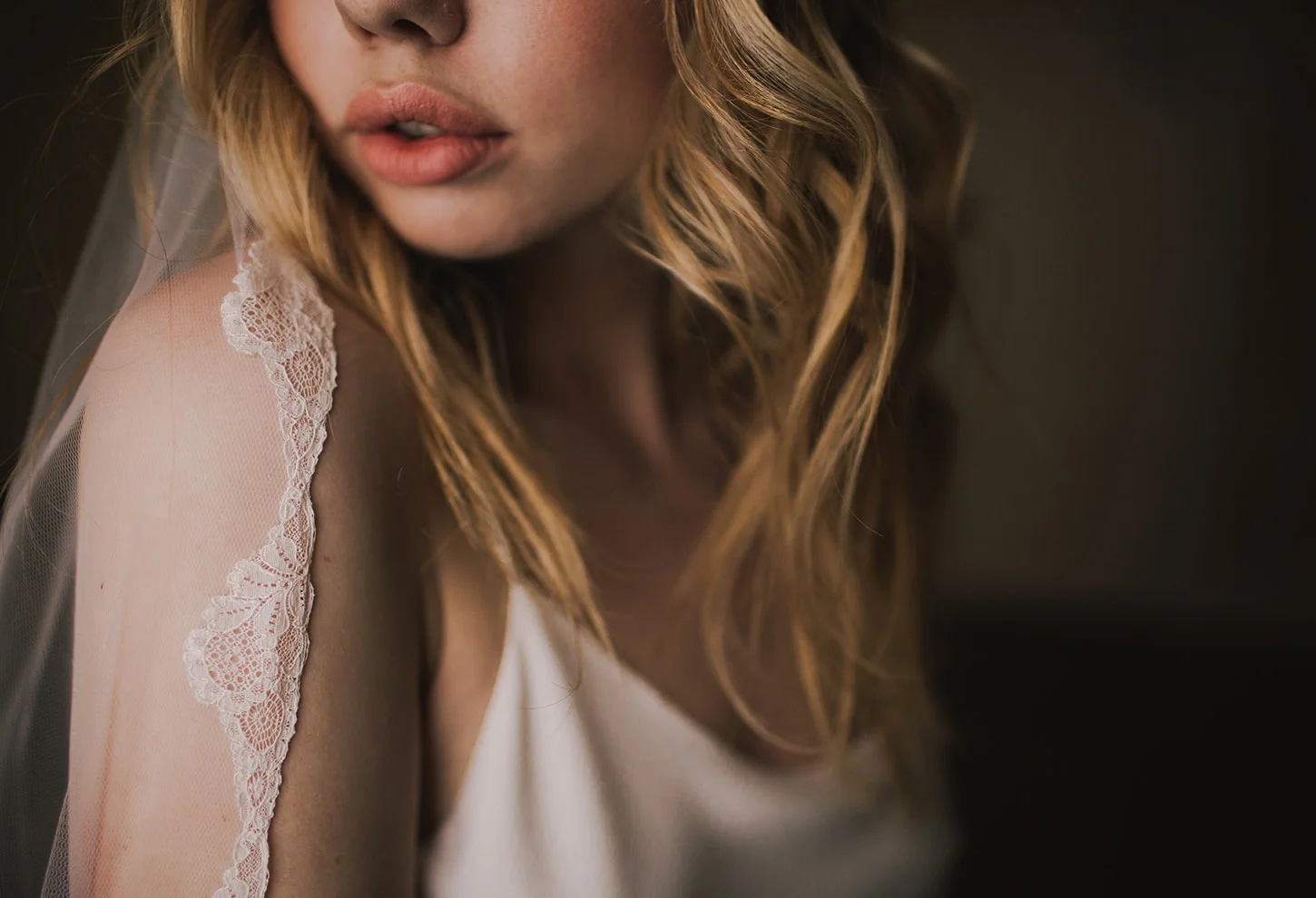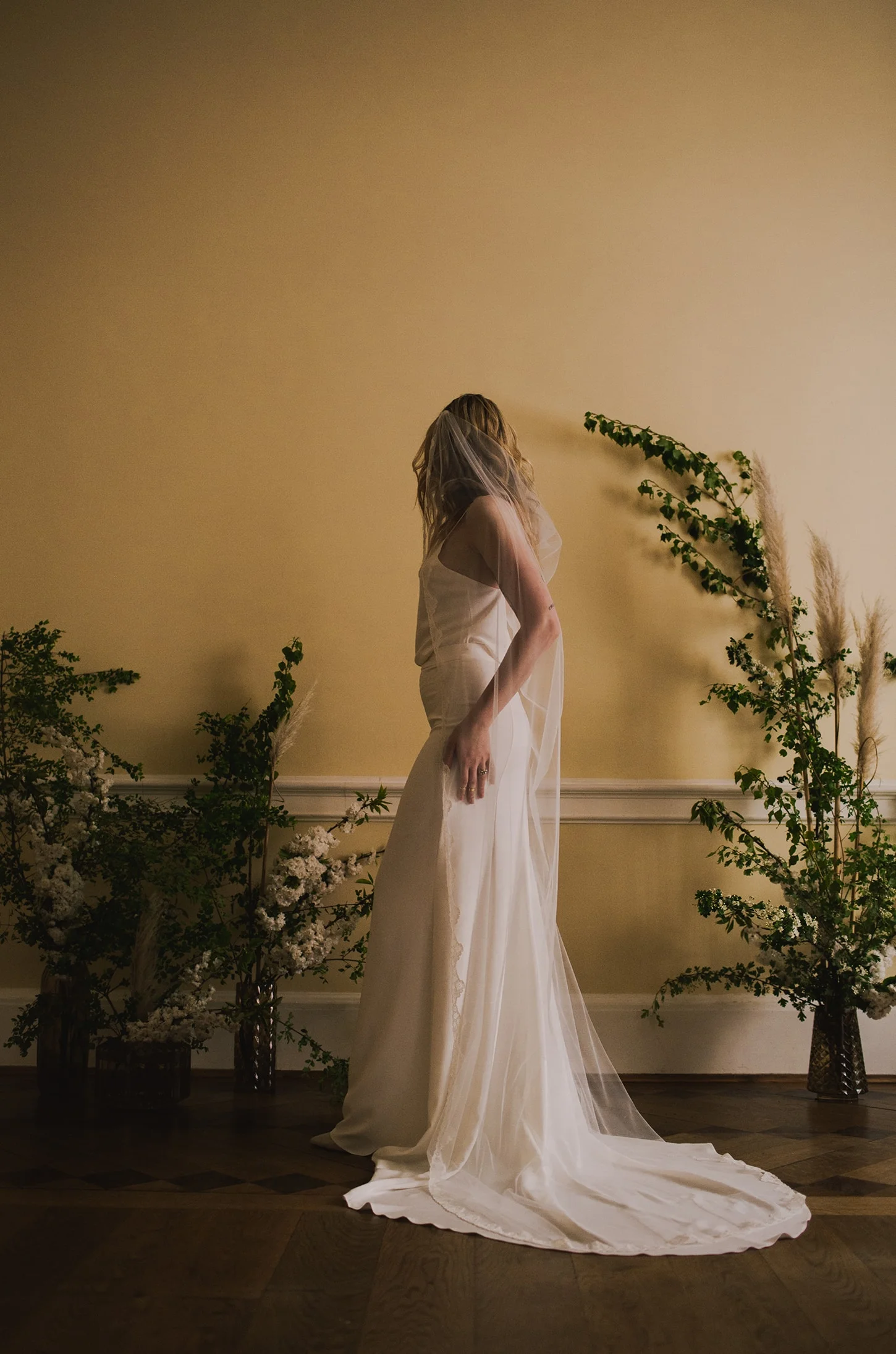 The brides look was created by an absolute dream team. Minimal, modest and fashion inspired was the brief. Sylwia Kunysz (MUA) made the models skin glow and enhanced her natural beauty with soft copper tones. Zoe of Knot Your Average Bride created tousled loose waves for an effortless look. Mcfayden Millinery provided a stunning, hand made 1930’s inspired chapel veil which added that vintage contrast to the brides modern and fresh look.