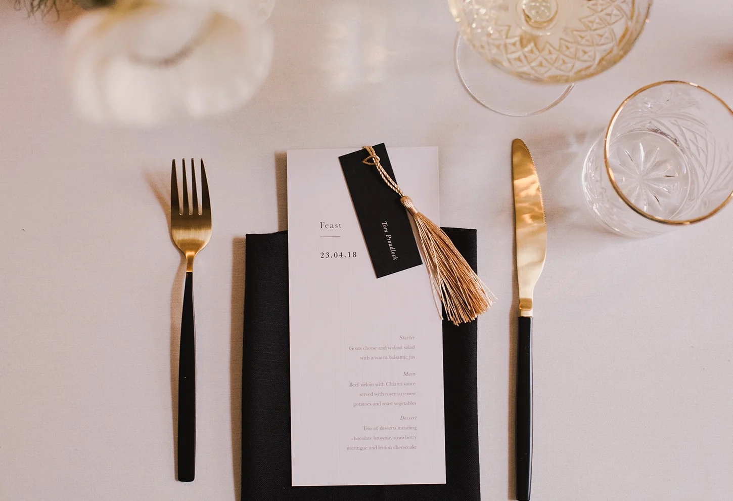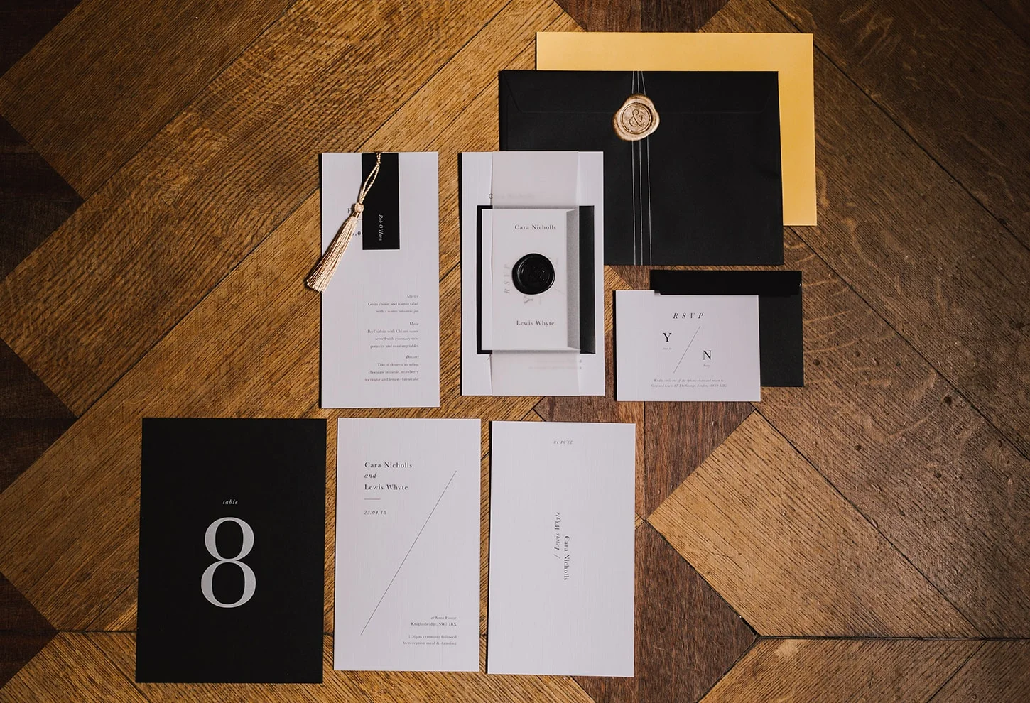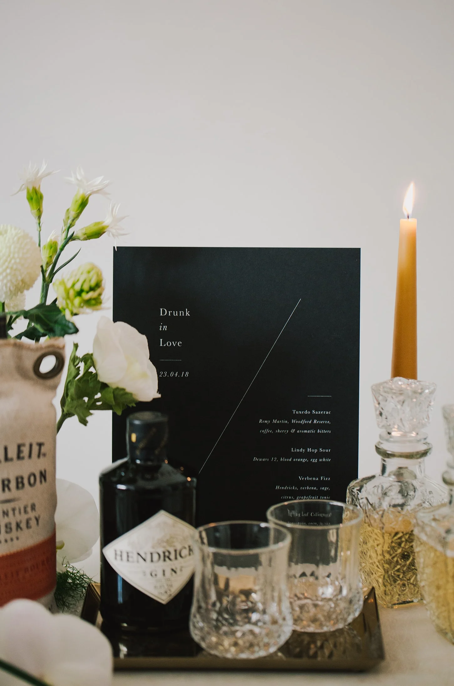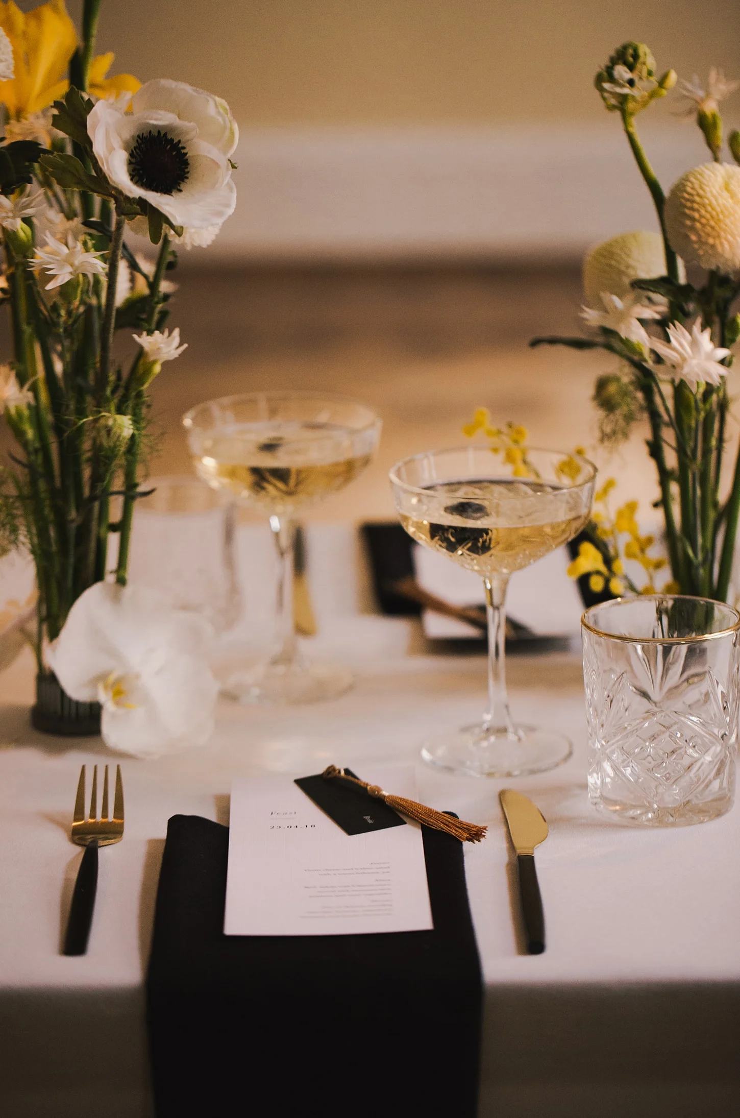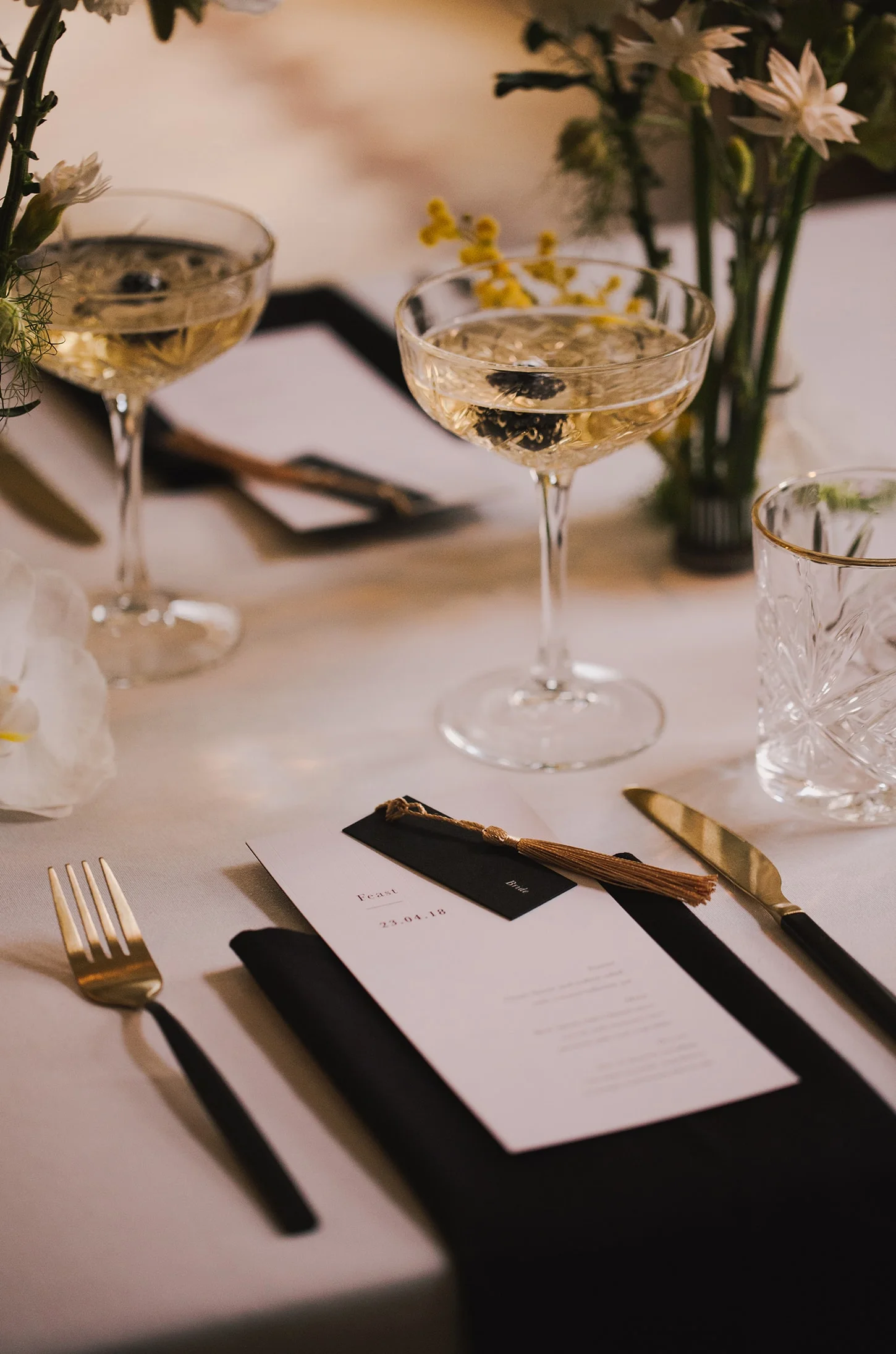 One of the most important aspects for me was the stationery. This is the first glimpse your guests see of your wedding and it needs to reflect the style and vibe of your day. I worked with Natalie of Nat’s Paper Studio and she instantly understood what I was asking her to provide. She created something simply elegant with clean lines and minimal content. The textured card stock was thick, demonstrating quality, the vellum provided delicacy and the hand made wax seals showed care and attention to detail. The menu cards incorporated the place names as I wanted to keep the table as uncluttered as possible. The menus were also finished with a gold tassel setting off the monochrome design perfectly. A work of art in their own right and they really represent the vibe of the day.